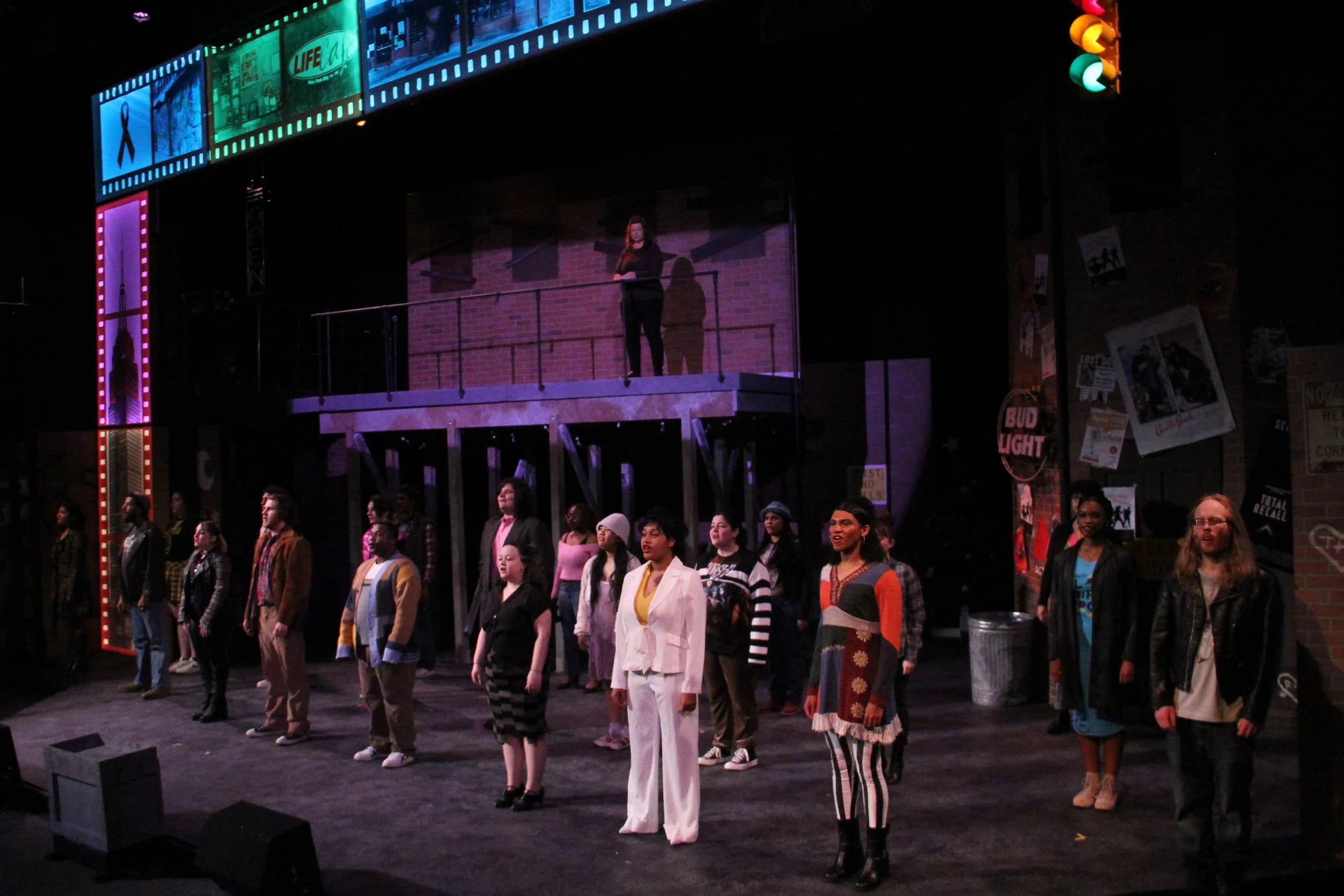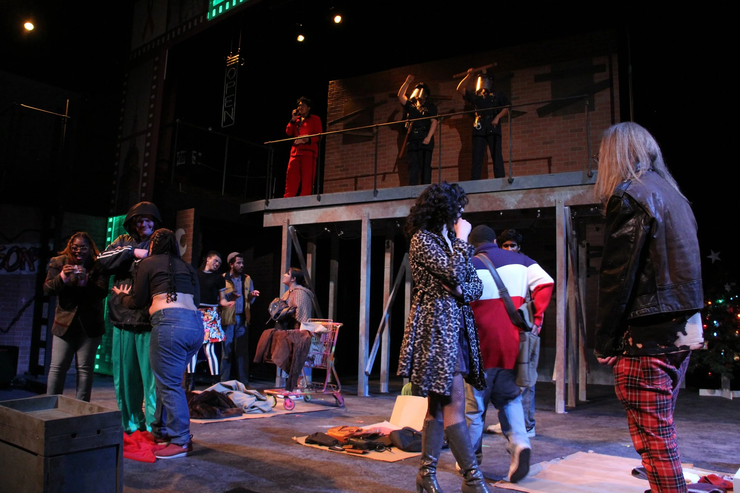 As part of my classes at MCCC, Stage Crafts and Lighting Technology, a team of students and myself constructed the set for the musical Rent as well as set dressing and other scenic art. For lighting technology, we refocused lights from the Kelsey Theatre rep plot as well as hung other lights for gobos, etc. I was also part of the small team that constructed the LED graphic-panel false proscenium where every panel was an individually addressed and controllable DMX LED.